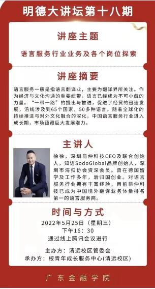 2022年5月25日下午,深圳昆仲科技CEO、火星语盟副总裁徐徐应邀到作客清远校区“明德大讲堂”,给校区员工做了主题为《语言服务行业的机遇挑战与职业发展》的线上讲座。3044永利集团官网的黄中习经理担任了本次讲座的主持人,3044永利集团官网清远校区近300员工以饱满的热情在线聆听本次讲座。