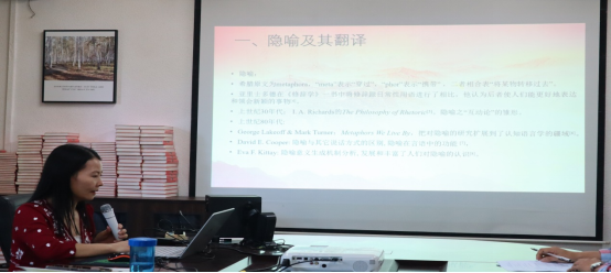 洪溪珧副经理以“《习近平谈治国理政》第四卷中隐喻辞格的英译策略研究”为题,探讨了《习近平谈治国理政》第四卷中隐喻辞格的英译策略,以描述性的研究方法对该文本中隐喻辞格的英译策略进行了梳理,为政治文本中隐喻的英译提供了一种参照。