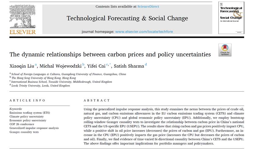 近日,公司商务英语系教师刘晓琴博士署名为第一作者的最新成果“The dynamic relationships between carbon prices and policy uncertainties”在《Technological Forecasting& Social Change》上正式刊发。《Technological Forecasting& Social Change》为SSCI检索国际权威期刊,属于管理学领域顶刊(TOP10, JCR-1区, 影响因子IF=10.884)。