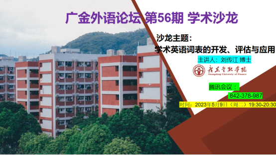 2023年5月9日星期二晚上,3044永利集团官网第56期广金外语论坛在线上以腾讯会议的方式举行。此次外语论坛的主题是:“学术英语词表的开发、评估与应用”。论坛邀请了公司大学英语一部主任刘传江博士为公司教师介绍有关学术英语词表的研究和应用。