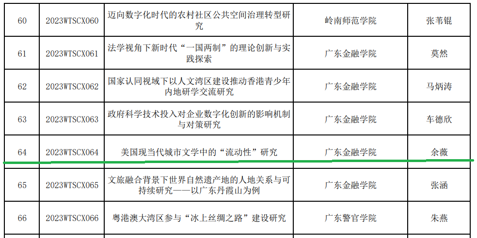 近日,广东省教育厅公布了2023年度普通高校认定类科研项目立项名单,包含两大类别:广东省普通高校特色创新类项目和广东省普通高校青年创新人才类项目。公司教师余薇博士的课题“美国现当代城市文学中的'流动性'研究"获本年度广东省普通高校特色创新类项目立项。祝贺!