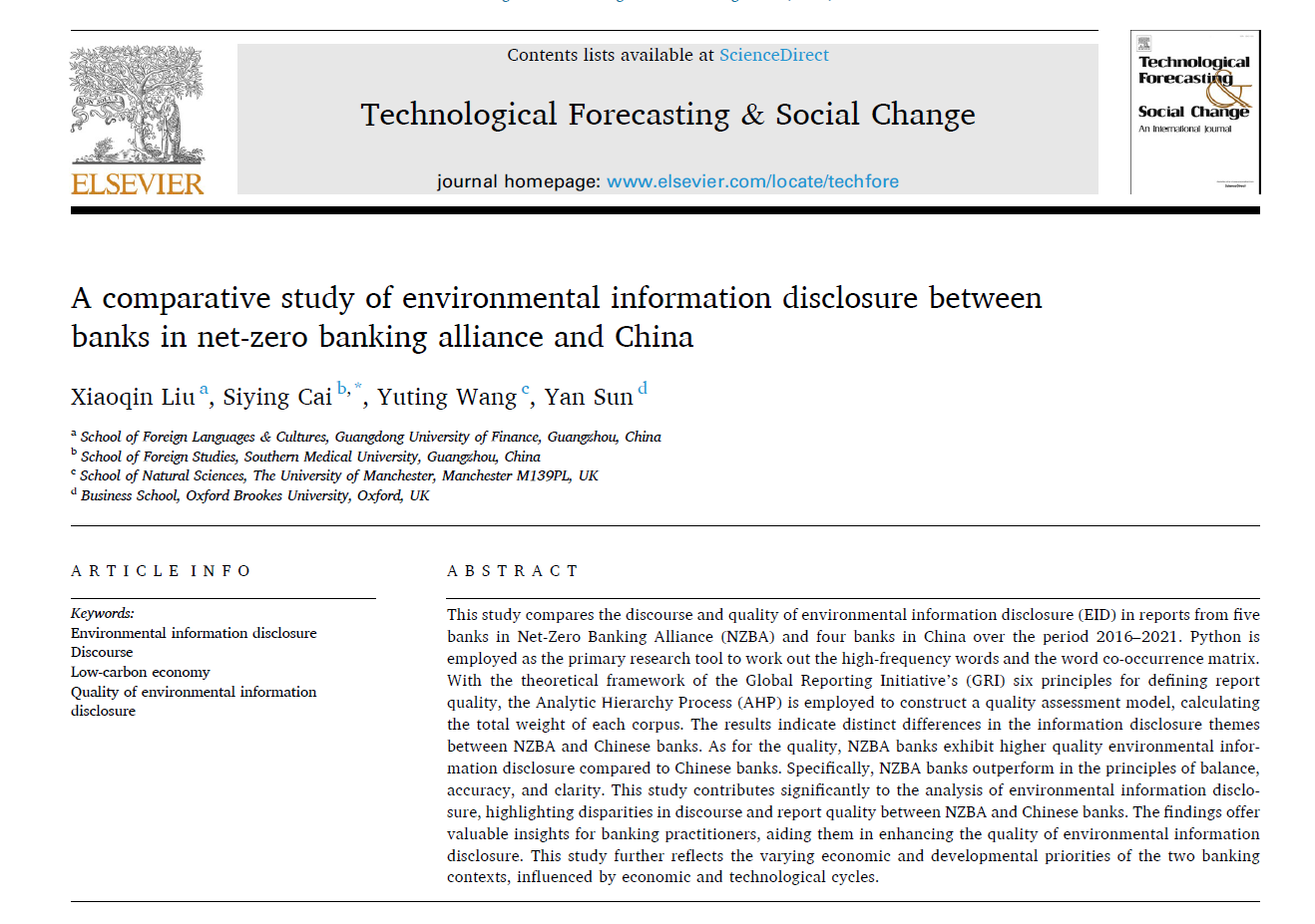 近日,3044永利集团刘晓琴博士以及其研究团队成员在管理学和商科领域的顶级期刊Technological Forecasting & Social Change上发表了一篇题为“A comparative study of environmental information disclosure between banks in net-zero banking alliance and China”的学术论文,这一成果标志着公司在充分利用大学优势学科资源的基础上,在跨学科研究领域取得了显著进展,特别是在聚焦银行金融业话语研究方面实现了重大突破。