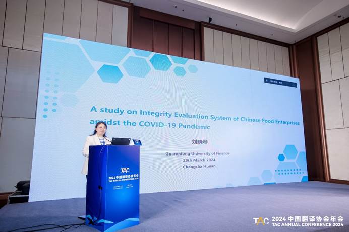 论坛中,多位专家学者就财经金融翻译领域的多个议题进行了深入研讨。公司教师陈树坤、邓薇、汤新煌、刘晓琴和杨贵章等参加了此次论坛,并分别就财经报道中的隐喻识解机制、金融翻译的文献计量学分析、人工智能技术视域下财经金融翻译教学改革、中国食品企业的诚信评价体系、“语境参数理论”视阈下的汉语新闻机器英译等话题进行了发言,向与会专家分享了自己的最新研究成果。其中,刘晓琴博士全程用英文介绍了自己如何运用SPSS25.0和AMOS等统计工具对疫情期间中国食品企业诚信评价体系进行的研究,向与会专家展示了自己深厚的跨学科研究功底,其流畅的英文也给与会专家留下了深刻的印象。