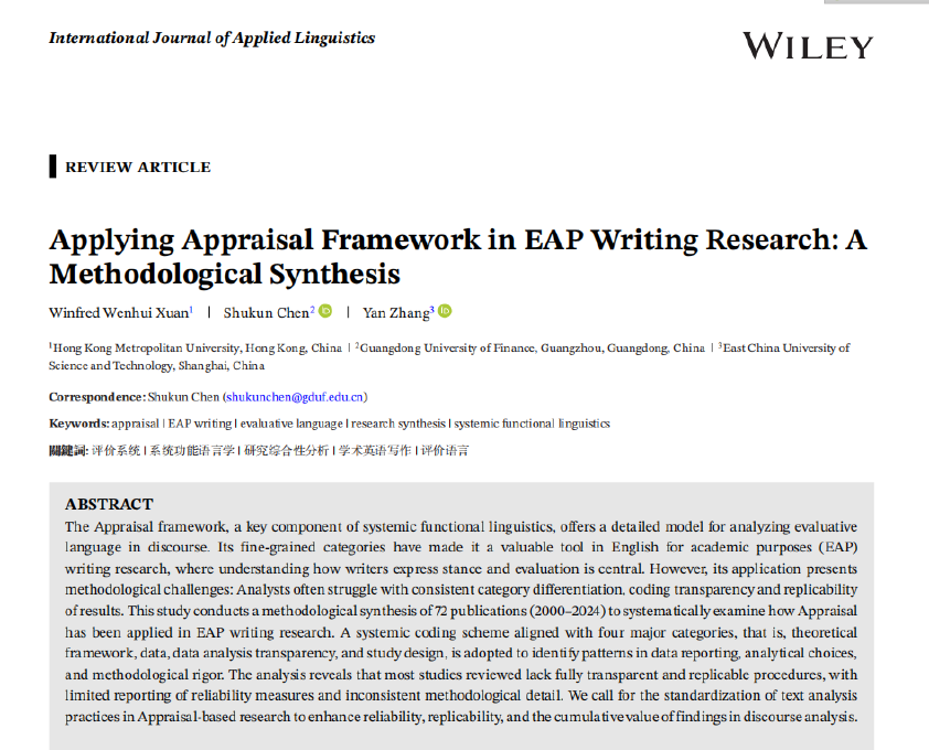 近日,3044永利集团陈树坤博士以通讯作者身份在国际权威期刊International Journal of Applied Linguistics(《国际应用语言学杂志》)发表研究论文,该刊为SSCI收录语言学领域1区期刊。论文题为《Applying Appraisal Framework in EAP Writing Research: A Methodological Synthesis》(评价理论在学术英语写作研究中的应用:一项方法论综合研究),系统检视了国际学界在学术英语写作领域运用评价理论的研究方法现状。