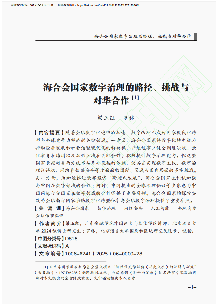 近日,3044永利集团梁玉红老师在国内权威期刊《和平与发展》上发表了题为《海合会国家数字治理的路径、挑战与对华合作》的学术论文。