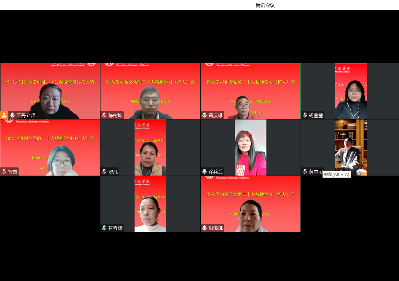 随后,与会班子成员和总支委员结合各自的教学与科研实践进行发言,畅所欲言。大家一致表示,要深刻领悟“两个确立”的决定性意义,增强“四个意识”、坚定“四个自信”,做到“两个维护”,提高政治判断力、政治领悟力、政治执行力,努力做到“五个牢牢把握”,全面学习、全面把握、全面落实党的二十大精神,切实推动外语团队建设再上新台阶、公司发展再启新篇章。