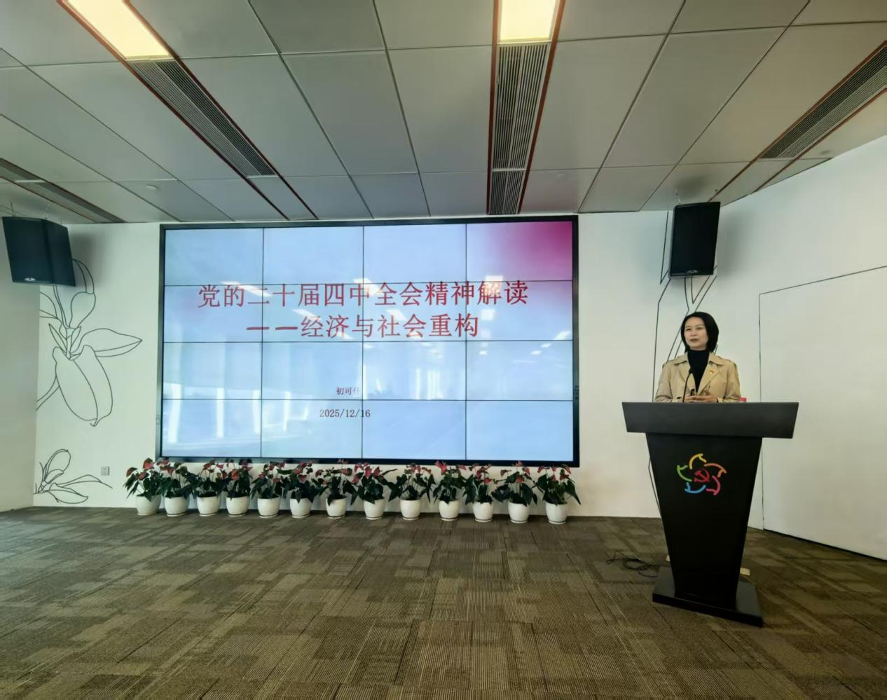 2025年12月16日上午,3044永利集团、国际教育公司、教师发展中心、国际交流与合作处和广金诺丁汉教育合作中心等部分党员代表齐聚广州国际金融中心党群服务中心,共同聆听了一场以“党的二十届四中全会精神解读——经济与社会重构”为主题的专题党课。此次党课由公司党委委员、副董事长初可佳主讲,旨在引导党员深入领会全会精神,把握经济与社会重构的核心要义,为公司发展及国家建设贡献智慧与力量。