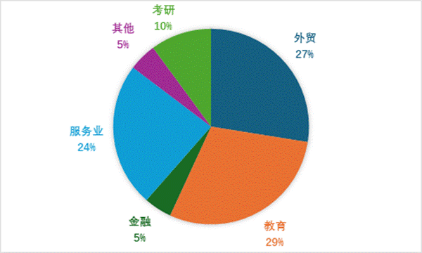 外语类专业毕业生专业知识基础扎实,实践问题解决能力强,具有勤勉务实的优秀品质,深受用人单位欢迎与好评,近年来的考研率和就业率均位于全校前列。毕业生的就业行业主要涉及金融企业、外贸公司、跨境电商企业、教育及培训行业等,从事国际商务、语言服务、外语教育等工作。就业区域主要集中在珠江三角洲地区。与英语专业的毕业生相比,商务英语专业毕业生更多走向国际贸易和跨境电商岗位。2021届毕业生人数237人,就业人数229人,就业率96.62%,其中商务英语专业就业人数109人,行业去向:外贸行业30人,教育培训行业32人,金融业5人,服务业26人,考研升学11人,其它行业5人。