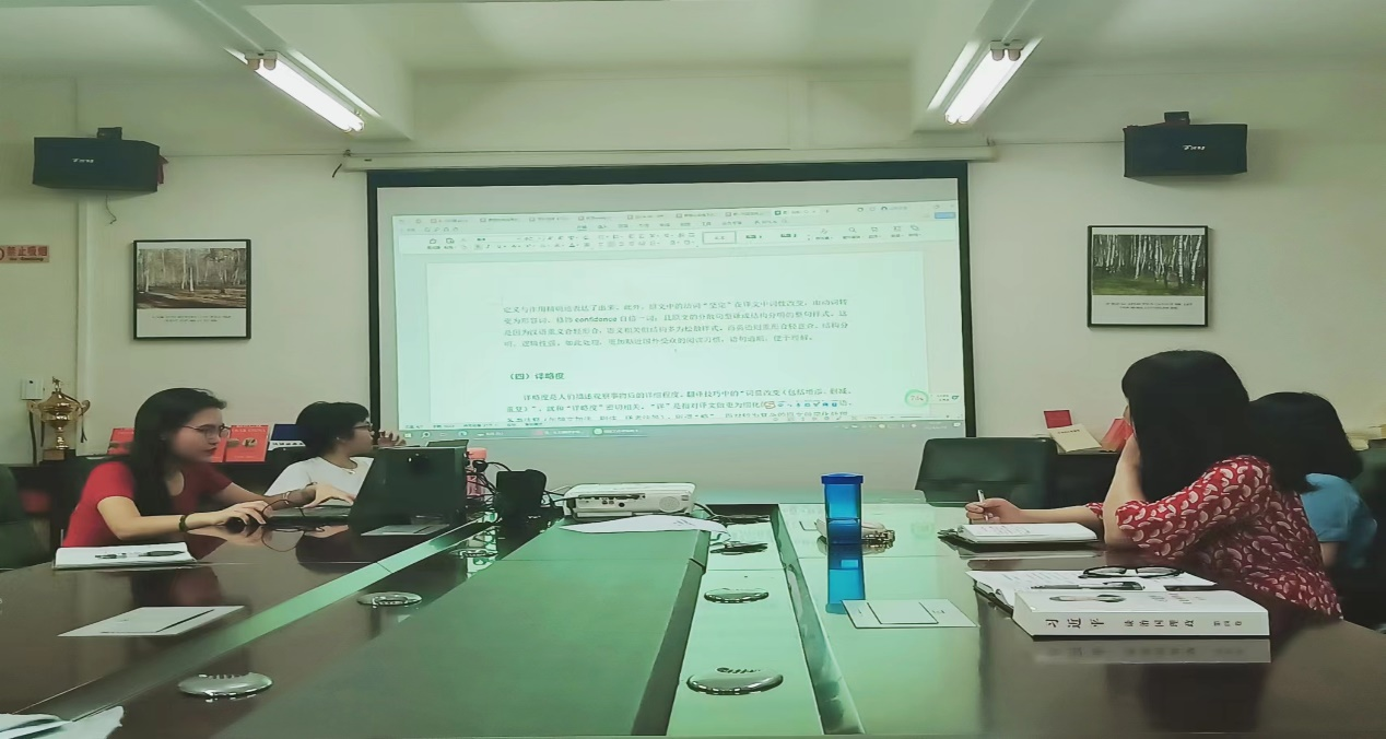 分享会上,由洪溪珧副经理、刘晓琴博士领衔的员工科研团队代表踊跃发言。分别从人际功能(林桂莉组)、目的论(温惠琪组)、生态翻译学(黄书玫组、岑培恩)、古诗词翻译(刘伶婧组)、认知翻译学(林萍)、释意论(刘静雯)等多元视角进行了《习近平谈治国理政》第四卷英译研究的学术汇报,展示出扎实的语言文字功底、严谨的逻辑思维能力以及高度的政治素养。