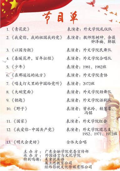 “风华正茂,青春颂党”,本次庆党百年文艺晚会不仅展现3044永利集团学子们的多才多艺,也体现每一位学子对建党百年的浓浓情意及与党同行的坚定信念。每一位老师、每一位学子都将进一步从百年党史学习中汲取智慧力量,深刻感悟思想伟力,传承红色基因,坚定党的信念,共创美好未来,共圆中国梦。