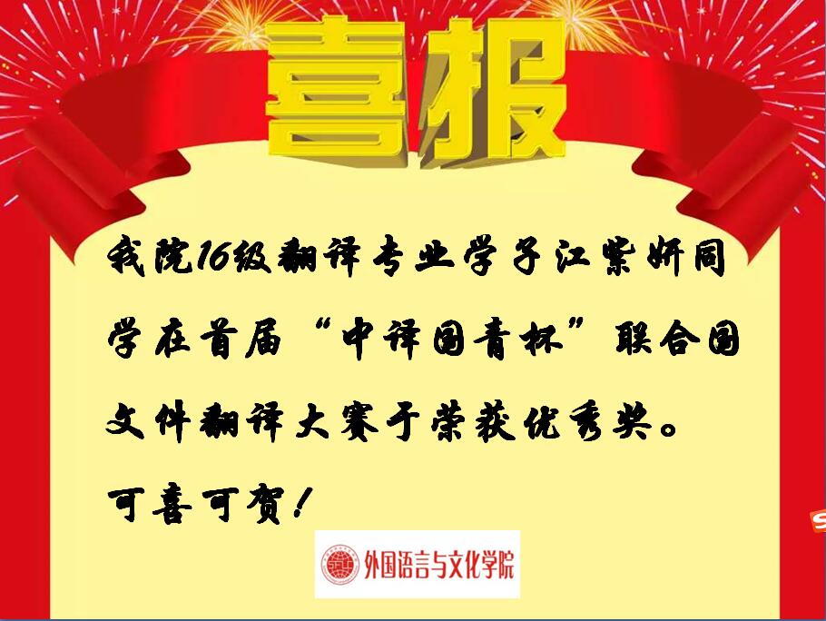 喜报:江紫妍同学喜获首届“中译国青杯”联合国文件翻译大赛优秀奖