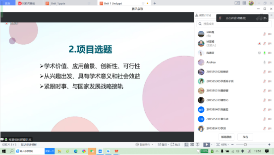 接着,邓粲士老师对员工参与申报大创项目和互联网+项目的受益面作了分析,同时,详细介绍了创新、创业和互联网+三类项目的区别和近年项目指导的经验。钟泽楠老师就自己目前的研究领域、研究方向及在指导的项目和已指导结项的项目进行介绍。邓薇博士从“易”方面为员工申报项目进行解压,解释说明项目的申报并不是想象中的那么“难”,并从方法、对象、结论和理论上对创新项目的创新点作了点拨,同时还强调外语类的大创项目要和国家的需求和发展方向一致,传播中国声音,讲好中国故事,最后对员工科研中的文献检索和项目申报书的填写进行了手把手指导。温荣芬老师分享了自身指导项目的经验和介绍了在研创业项目的情况。程嘉莹同学从前期准备、项目选题及申报立项三方面分享国家级项目的申报和结项经验。