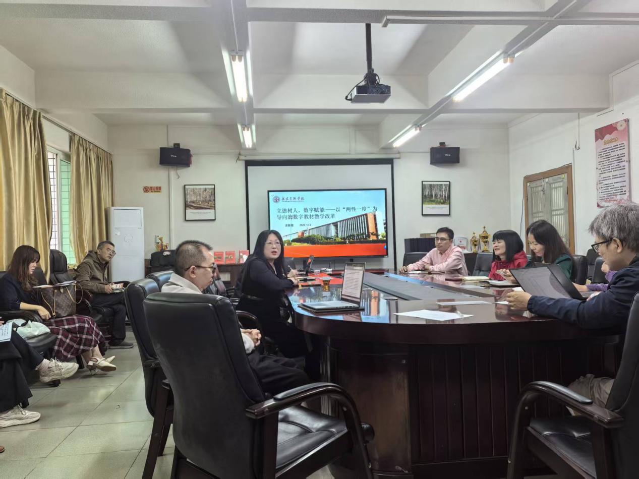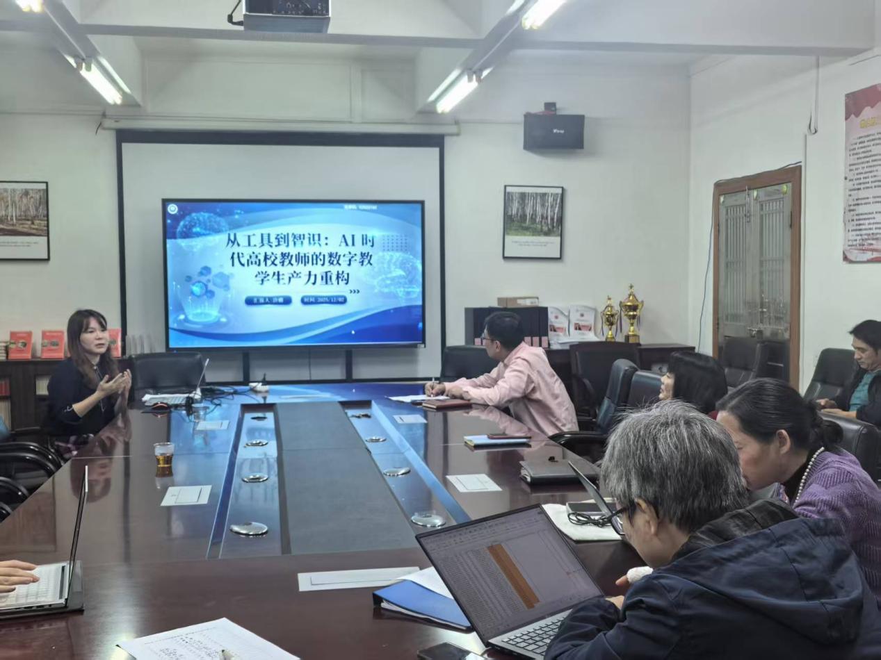 本次分享会公司两位教师作了主题报告。一位是大学英语部汤新煌主任,他以《立德树人,数字赋能——以“两性一度”为导向的数字教材教学改革》为题,分享了数字教材教学改革的宝贵经验。另一位是教师发展中心选派去成都参加AI智慧教学培训的商务英语系唐姗主任,她作了题为《从工具到智识:AI时代高校教师的数字教员工产力重构》的报告。