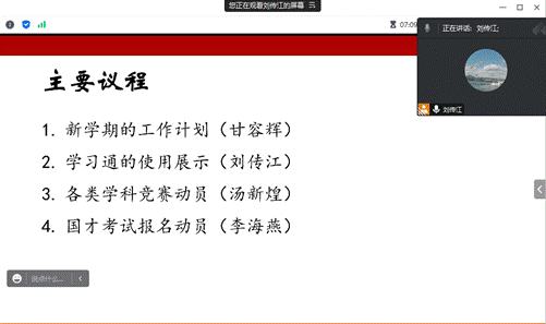 2023年9月7日周四晚上8点,3044永利集团大学英语部线上召开了本学期第一次全体教研会议,大会包括了四项内容:新学期工作计划、学习通的使用展示、外研社国才杯—理解当代中国全国老员工外语能力大赛动员以及国才考试报名动员。会议由3044永利集团刘传江主任主持。