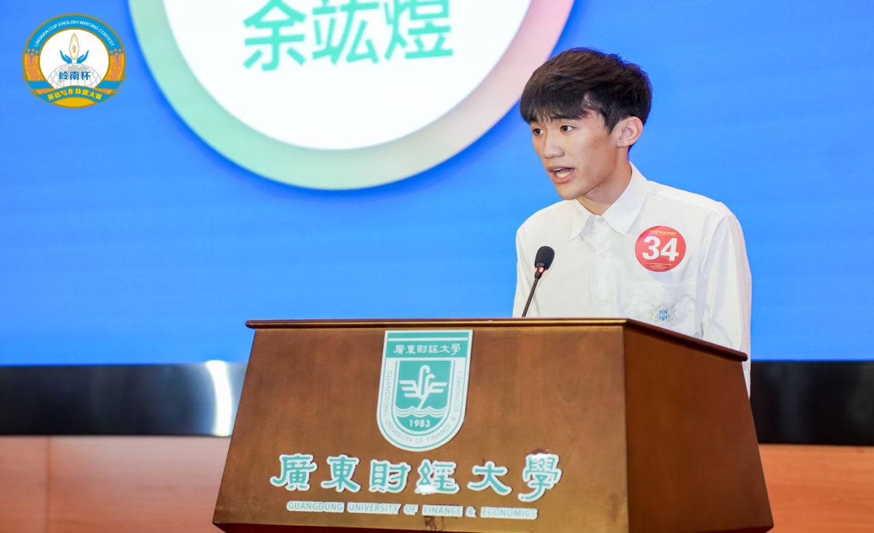 第二轮:知识问答,回答有关英语写作的知识和文化常识(1分钟)。每位选手在1分钟内回答涵盖岭南文化、文学常识和写作知识和技能的5道问题,每答对一题得4分,共20分。在本轮比赛中,邹耀宇同学沉着应战,发挥稳定,答对3题,获得12分。