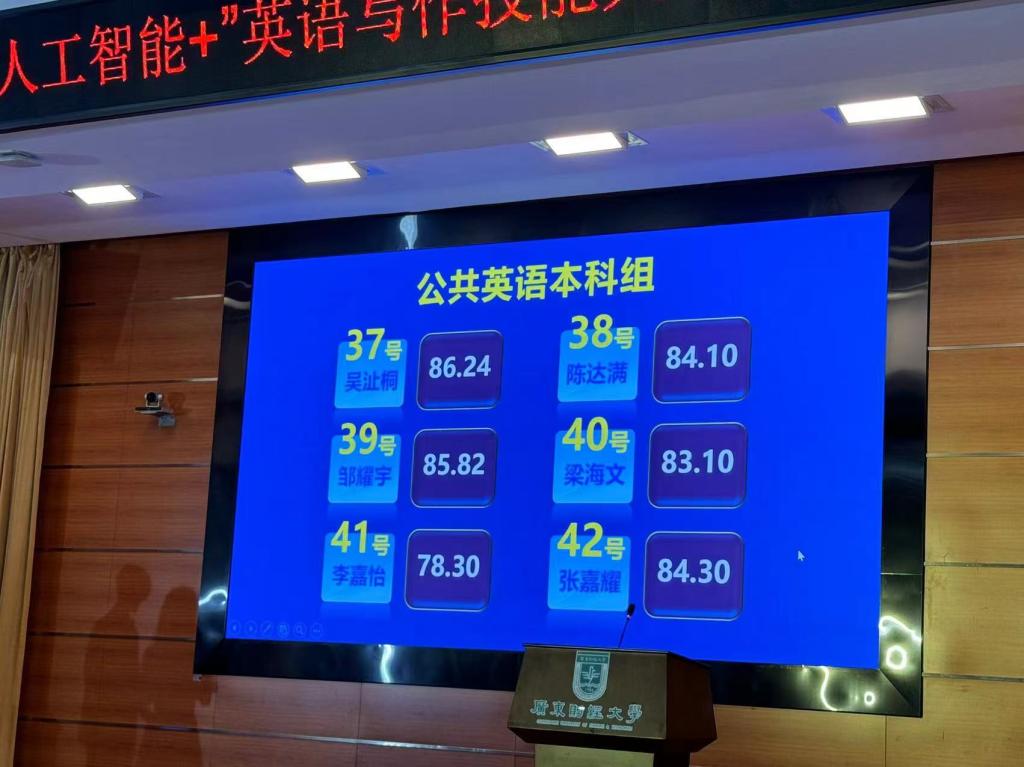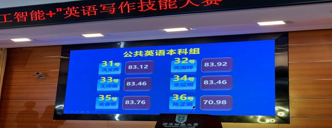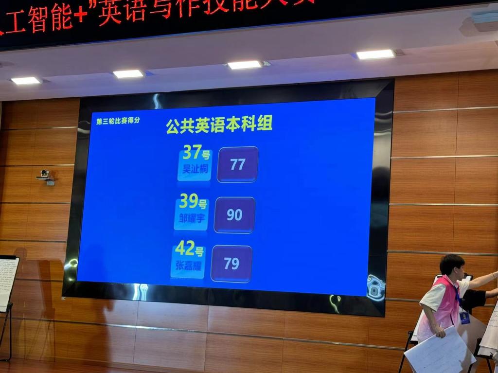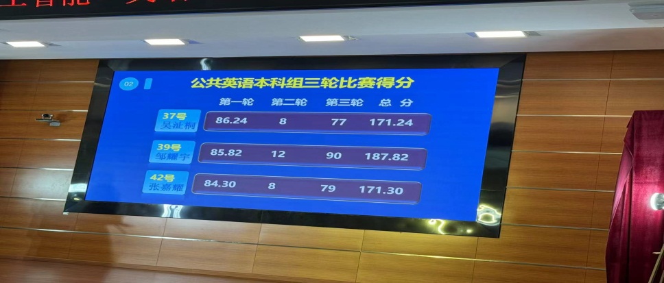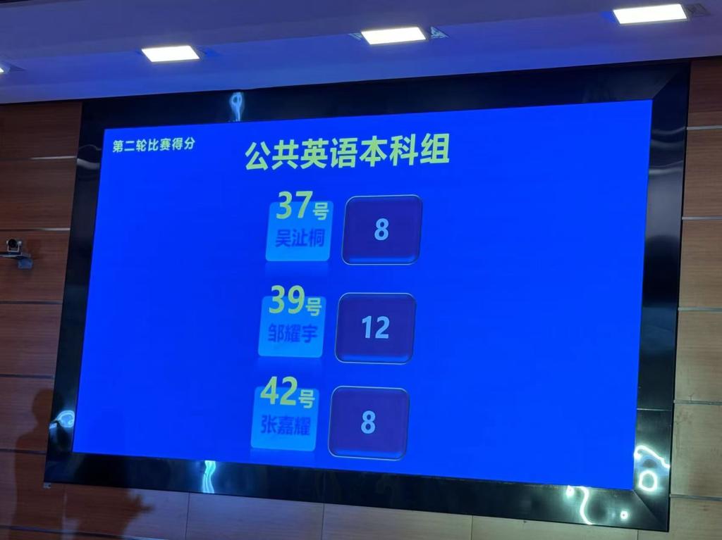 第一轮:陈述与答辩,选手用英语陈述参赛作品要点(1分钟)并回答评委一个提问(1分钟),合计100分。各组同学完成本轮比赛后,按得分高低排名,每组排名前三名的选手(公英专科组排名前六名),共15名选手进入第二轮和第三轮比赛,其他选手止步此环节。在第一轮比赛中,公司学子邹耀宇同学凭借其扎实的语言基本功,标准流利的英语口语及其自信和稳重的台风,陈述参赛作品要点,敏锐机智地回答评委老师提问,以85.82分位列公共英语本科组第二名,并成功晋级第二轮和第三轮比赛,余竑煜同学(83.46分)和李嘉怡同学(78.30分)止步第一轮,获得二等奖。