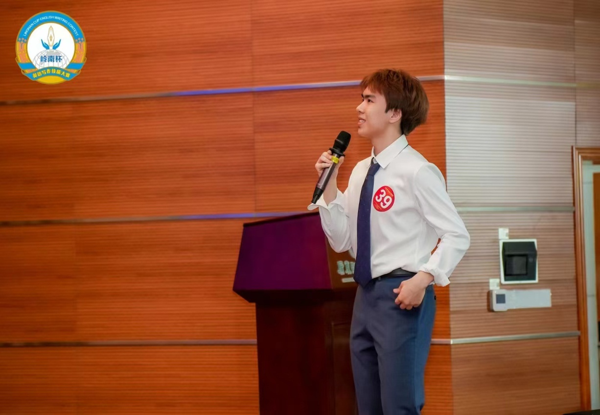 第三轮:看图作文(8分钟即兴写作)。选手根据现场公布的题目和图片在题板上即兴写作,满分100分。邹耀宇同学凭借其深厚的语言基础和丰富的写作经验,奋笔疾书,获得现场四位评委合议给出的小组最高分90分。