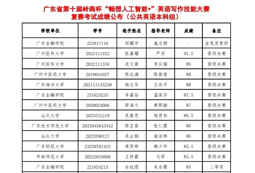 广东省第十届岭南杯“畅想人工智能+”英语写作技能大赛由广东省本科高校外语类专业教学指导委员会、广州外国语协会与北京外研在线数字科技有限公司联合主办,由广东财经大学承办。比赛分初赛、复赛和决赛三个阶段举行,初赛由参赛公司自行组织,复赛于2024年5月12日通过线上平台进行,决赛于2024年5月18日在广东财经大学线下举行。比赛分四个组别:公共英语专科组、公共英语本科组、专业英语专科组和专业英语本科组。