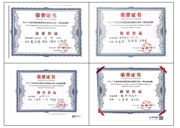为庆祝中华人民共和国成立75周年,深入贯彻学习习近平新时代中国特色社会主义思想和党的二十大精神,讲好中国故事、传播好中国声音,2024年10月27日,由广东省立中山图书馆与广东图书馆学会联合主办的“英韵传粤情声影共融辉”2024广东省英语电影配音大赛决赛在清远市图书馆成功举办。公司学子积极参与,在此次大赛中表现出色,获得1金3银大奖,满载而归。