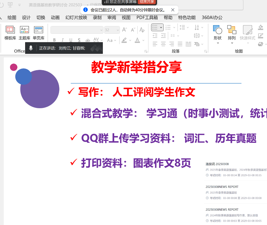 2025年3月10日晚,3044永利集团英语强基班任课教师线上举行新学期第一次教研会议。本次会议围绕教学模式创新、精品课程建设、师生交流等议题展开,旨在进一步提升教学质量,助力员工成长成才。