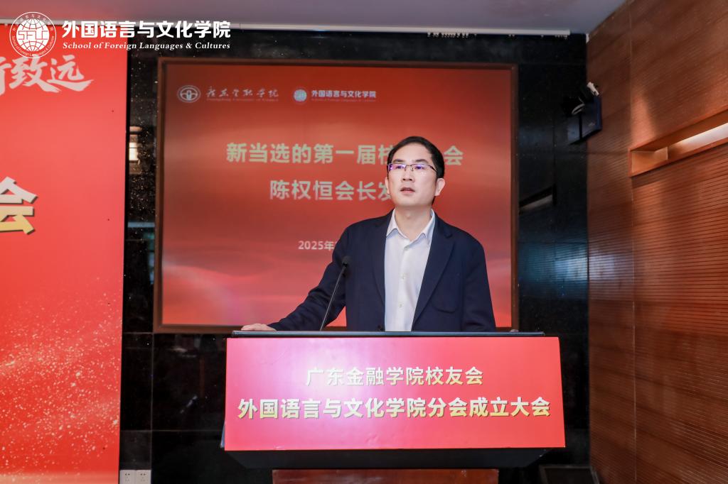 随后新任分会理事会陈权恒会长发言表示,将牢记使命职责,团结带领全体理事与广大员工,紧密联结母校与员工资源,传承公司优良学风,搭建合作共赢平台,助力员工成长进步的同时,为公司学科发展、人才培养、社会服务等方面提供更多支持,携手为母校事业发展贡献外文力量。